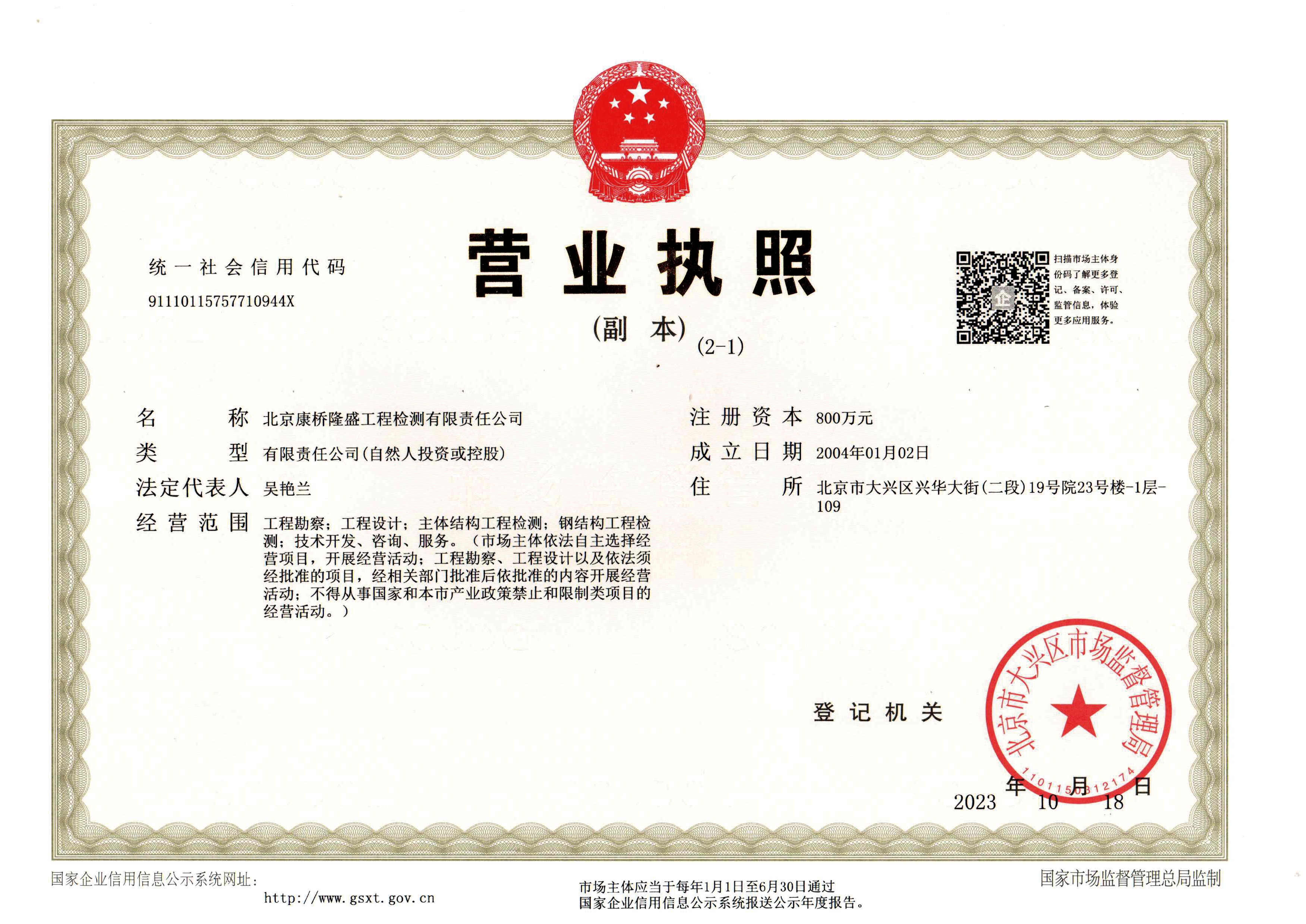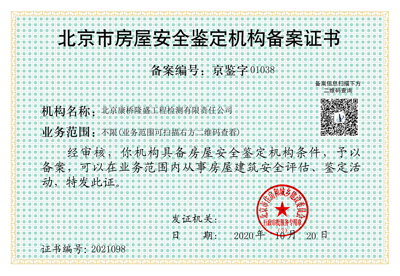 北京市房屋安全鉴定机构备案证书正本(业务范围为不限)