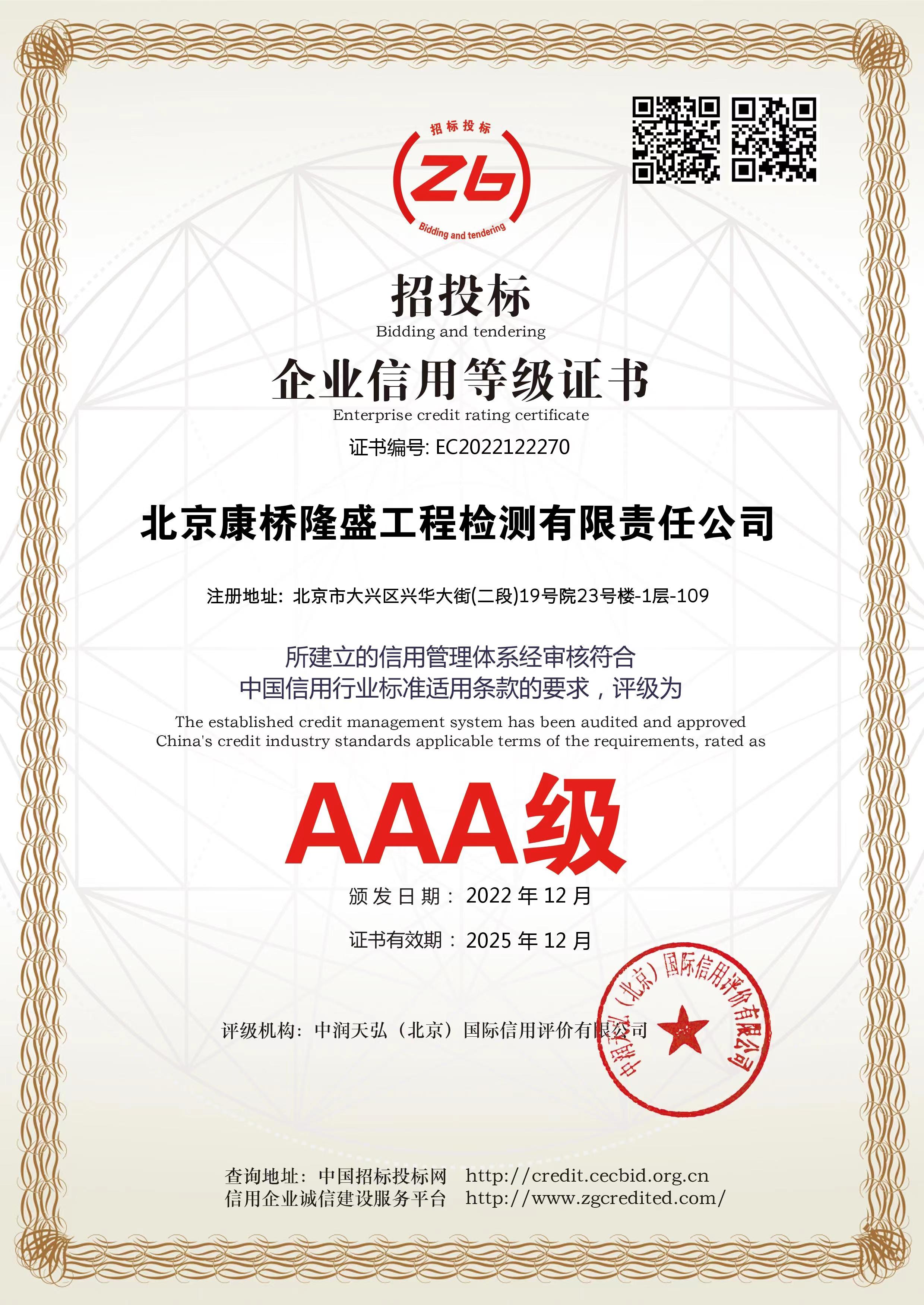 企业信用等级AAA级证书