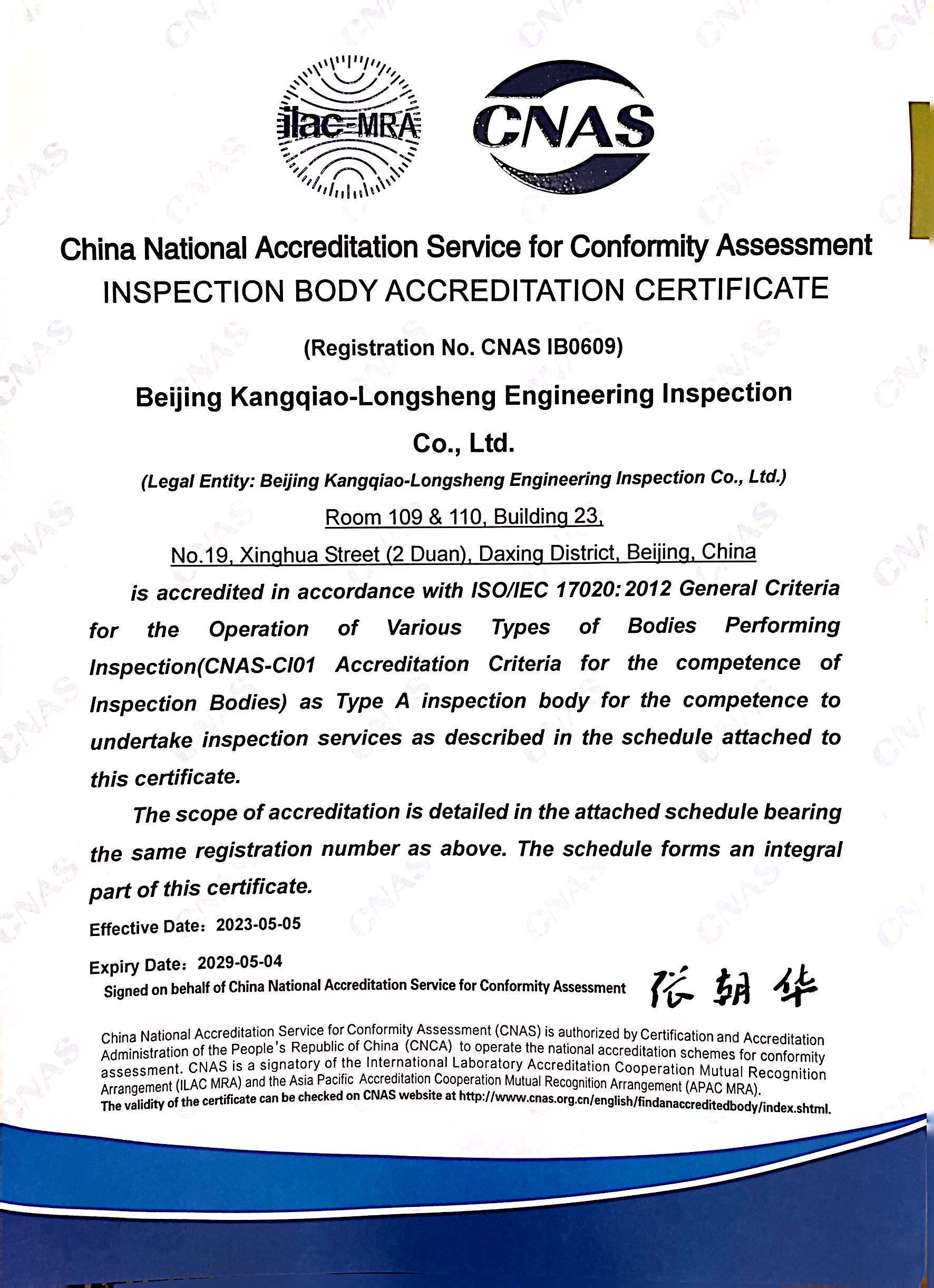 CNAS检验机构认可证书(英文版)