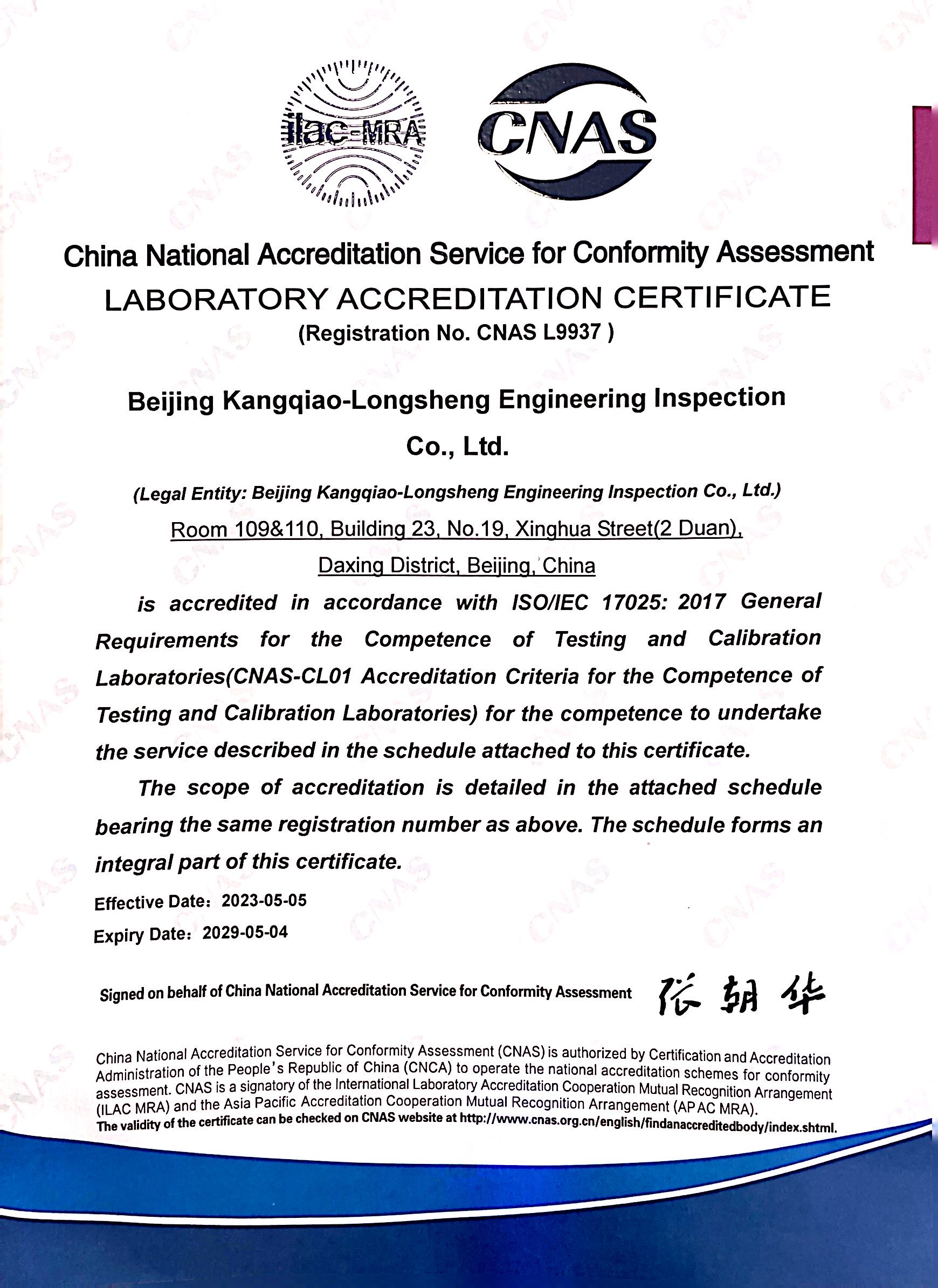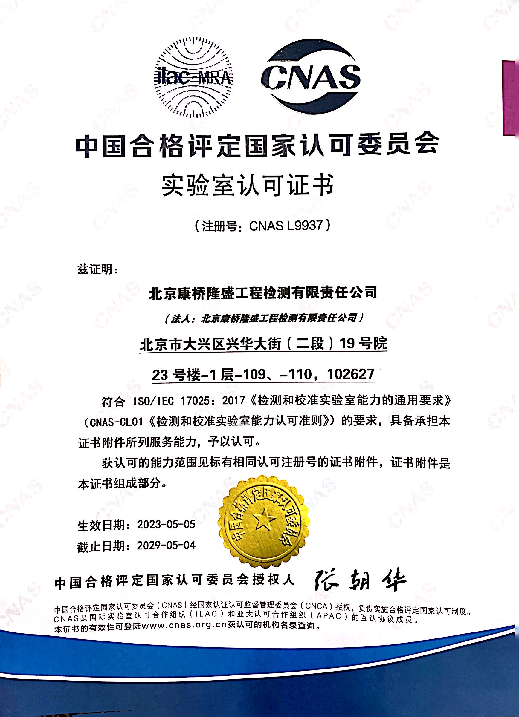 CNAS实验室认可证书(工程检测资质)